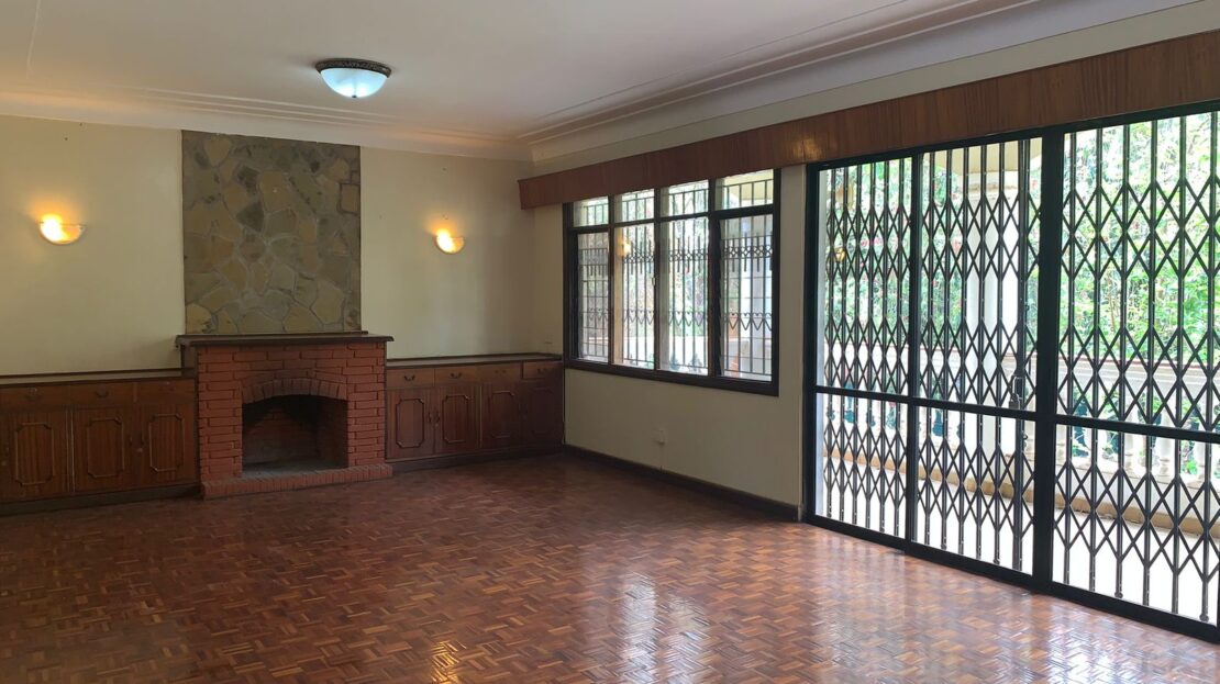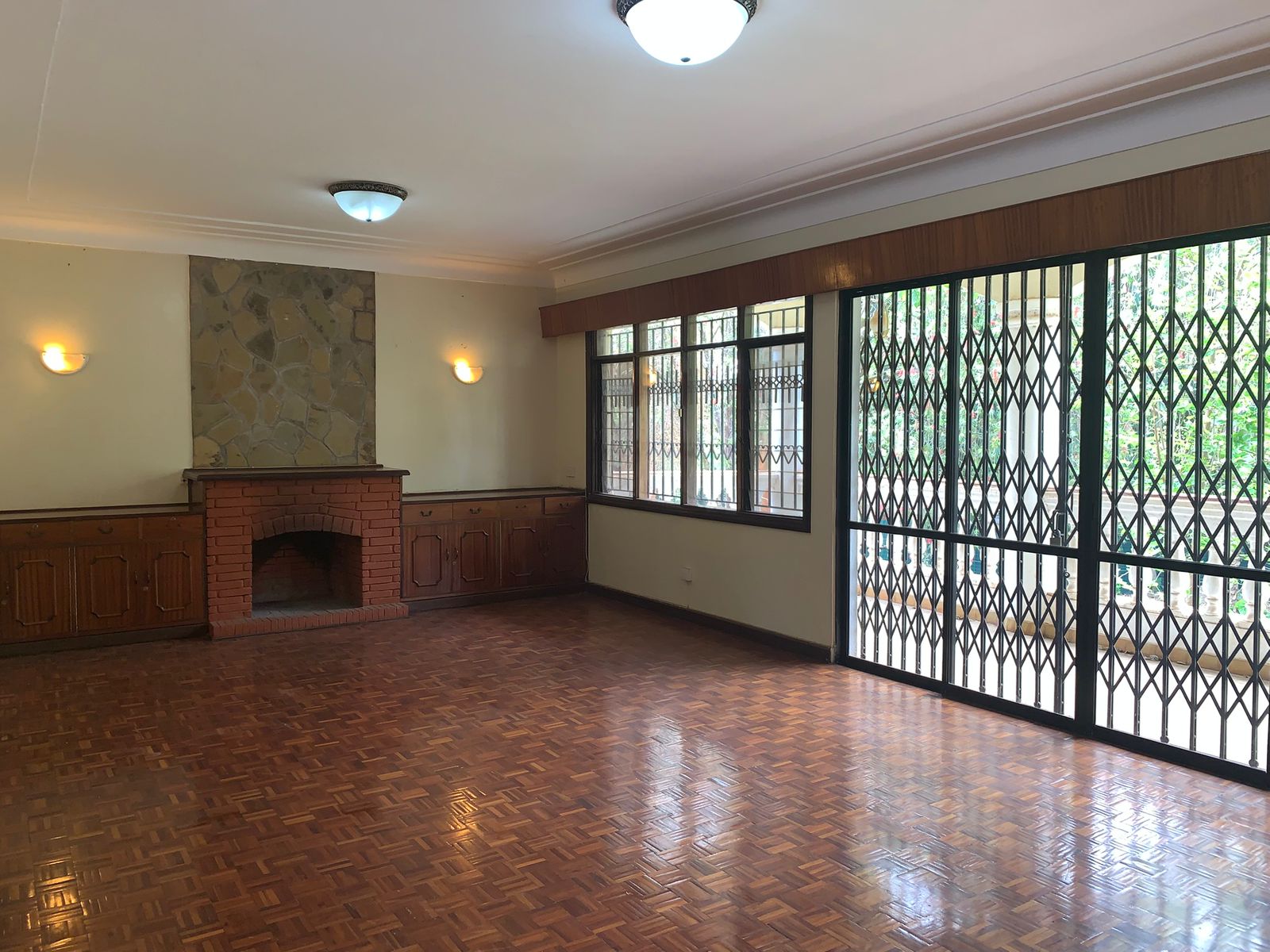 Sunken lounge with fireplace and large doors with a view of the garden